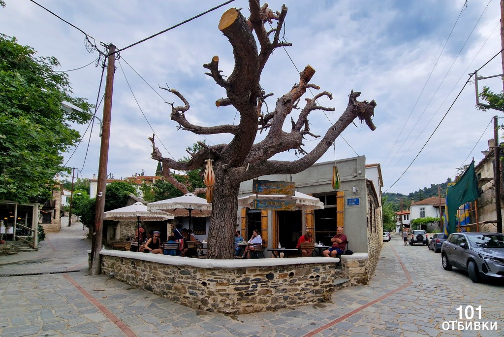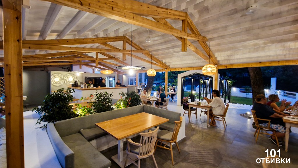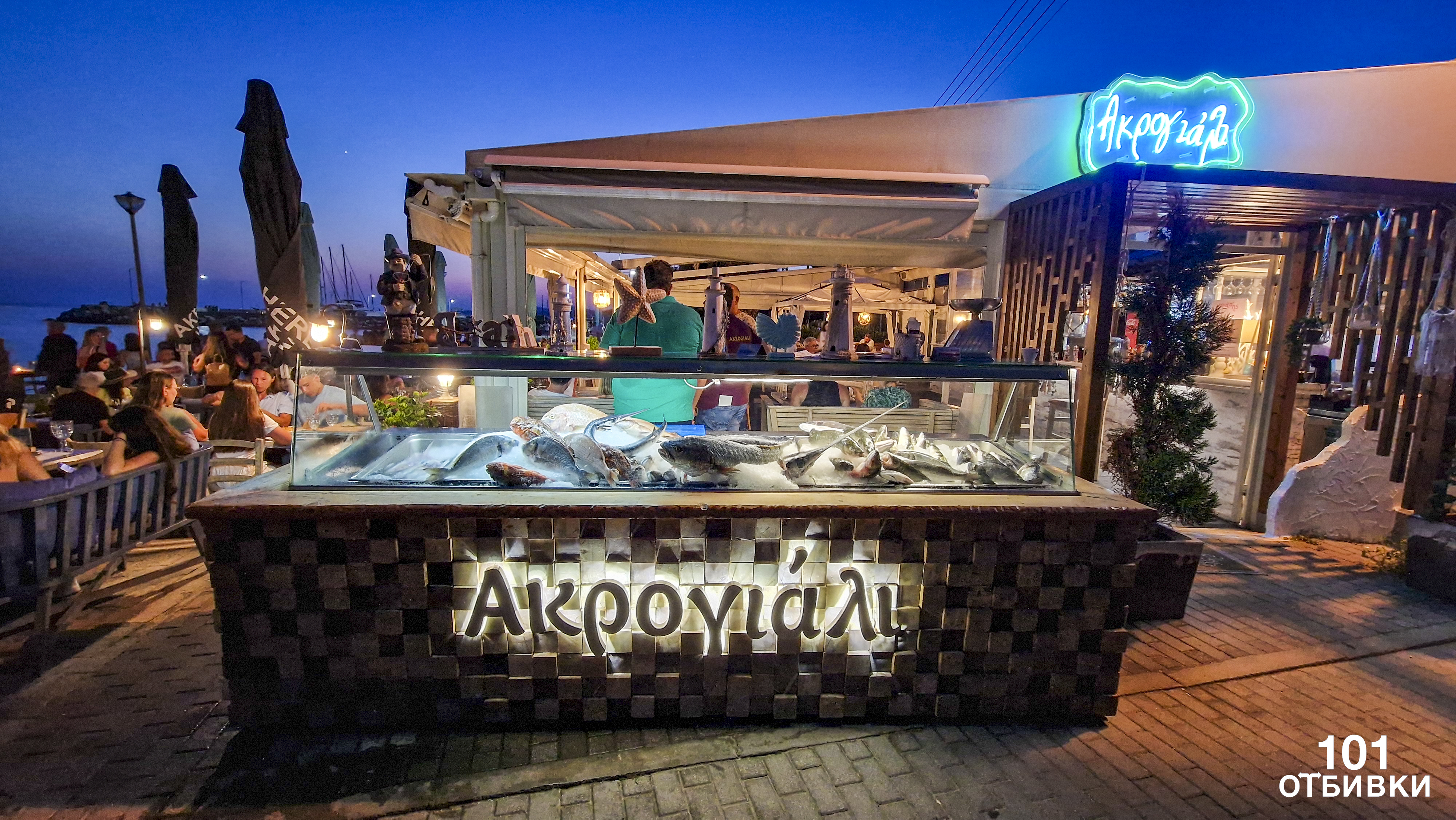 Пред него има хладилни витрини с различни видове прясна риба. Вечерно време е почти изключено да намерите свободна маса, ако нямате резервация. Цените са по-високи от средните за Никити – заради красивите гледки и централното местоположение.