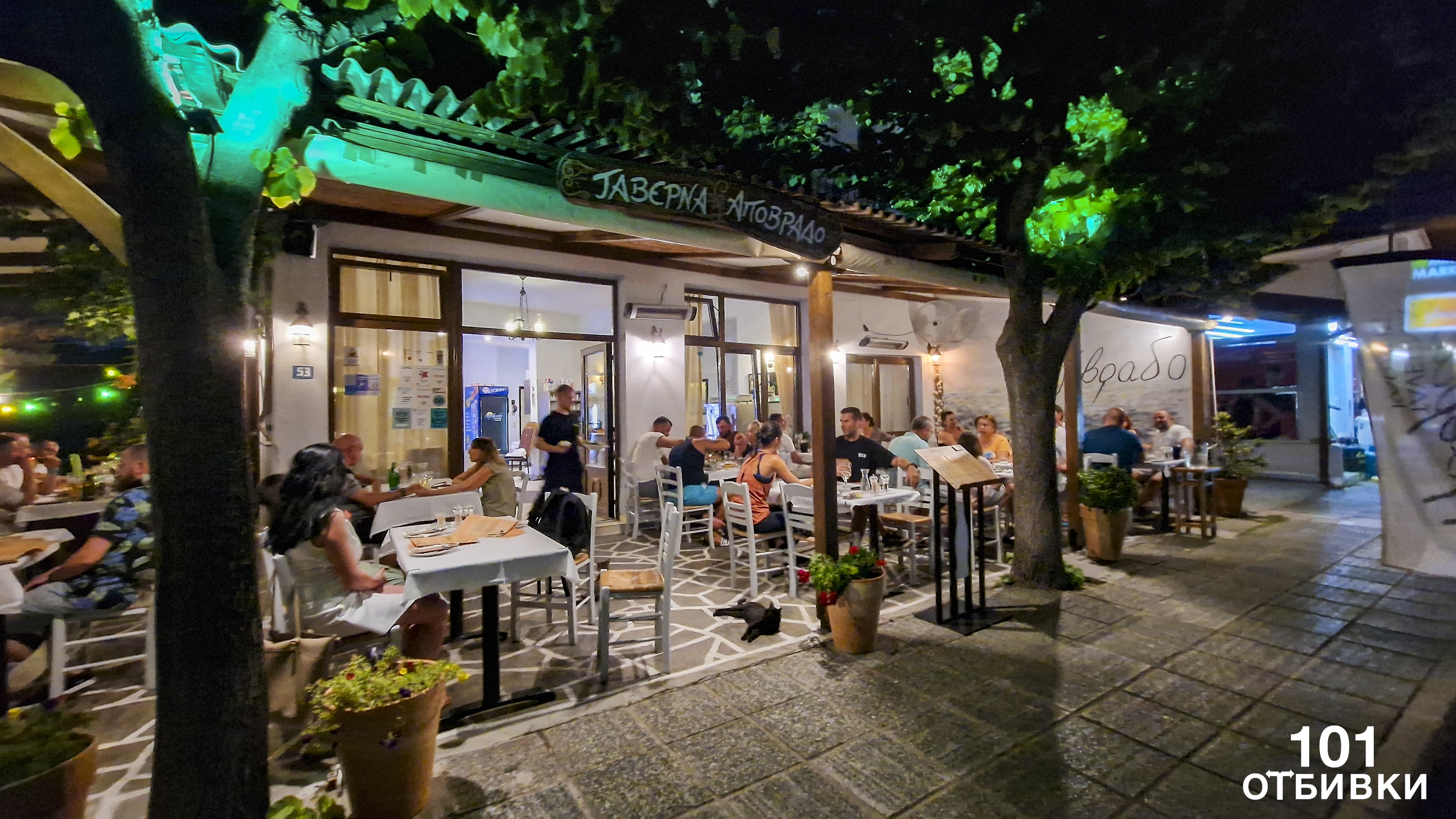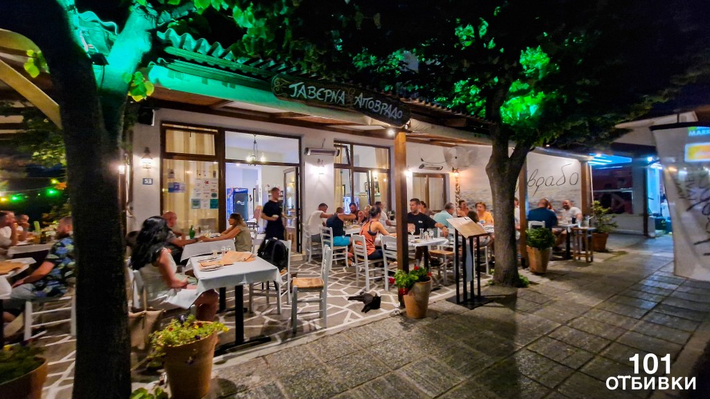 Таверна Απόβραδο (Apovrado) е нашият любим ресторант. При тазгодишното ни посещение вечеряхме основно там. Храната е много вкусна, приготвена по традиционни рецепти. Сред посетителите има много местни жители – сигурен знак, че кухнята е добра.